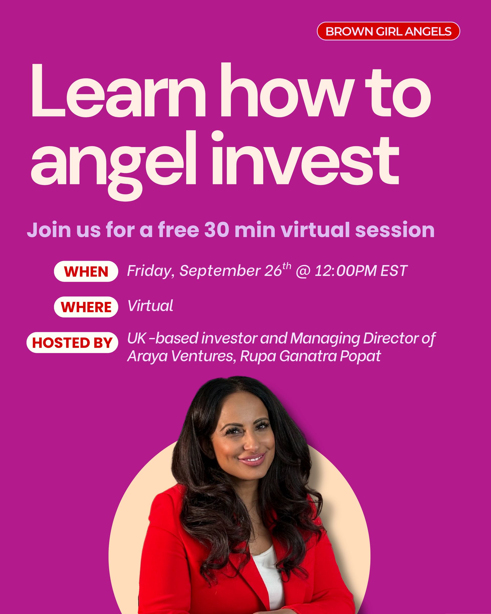 πΈ Thinking about angel investing but donβt know where to start? We got you. Weβre kicking off fall with a free 30 min virtual intro to angel investing session thatβs typically only offered to BGA members. But we just couldnβt gate keep this one. Led by Rupa Ganatra Popat β UK-based investor + Managing Director and Founder of ArΔya Ventures & AVA Investment Academy.